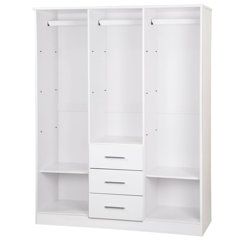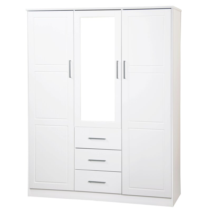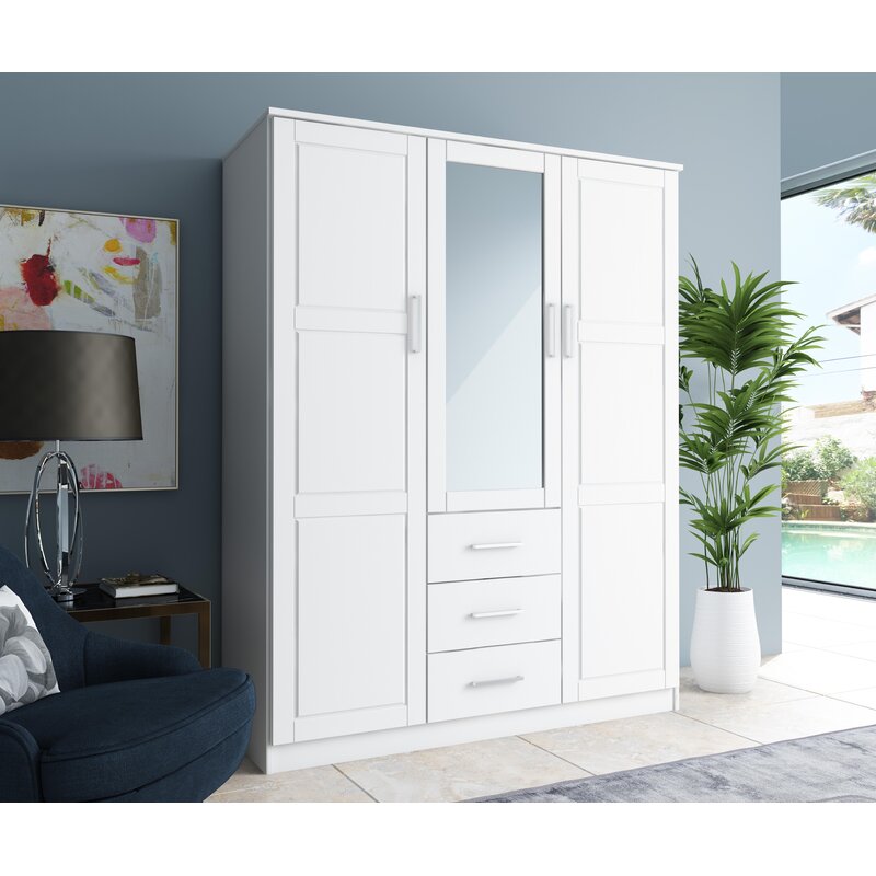 - DescriptionIn need of more storage? This modern armoire gives you extra space for all your favorite things. Its frame is made from solid pine wood in a crisp. versatile finish that goes with everything! A mirrored door in the middle gives you a convenient spot to check out your look and open up your room. It opens up to three open and adjustable shelves and a hanging rod that can house hats. sweaters. and ties. Two side compartments with carved accents have clothing rods at the very top to hang dresses. blazers. and long coats. Plus. three drawers open up on roller glides. allowing you to tuck away socks and delicates.