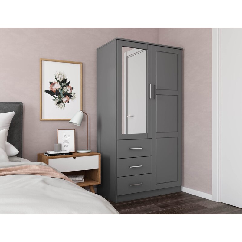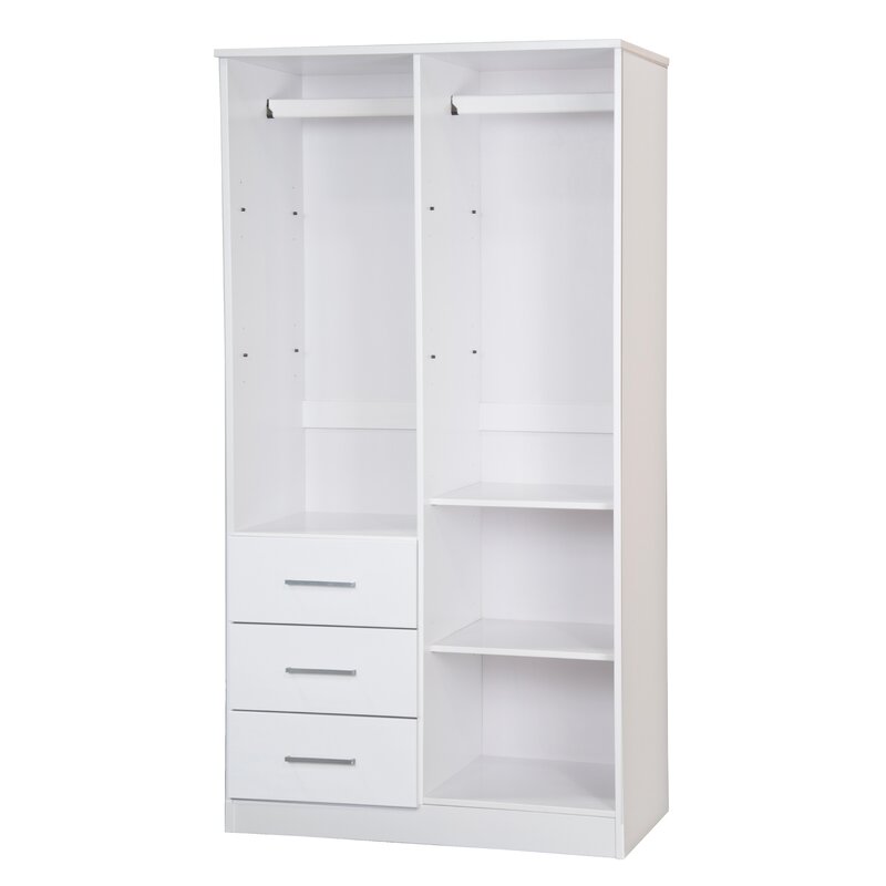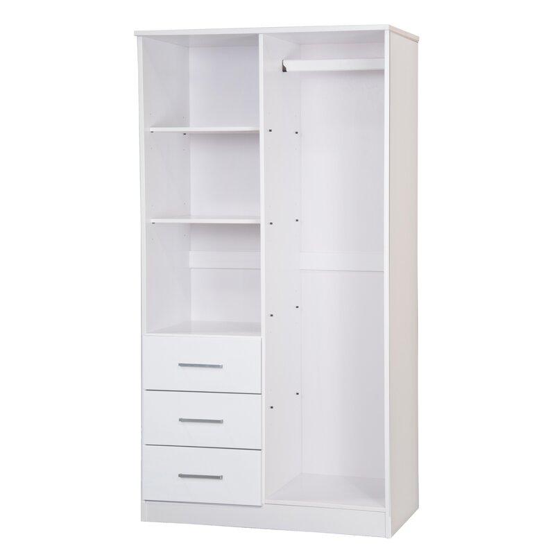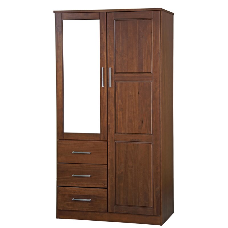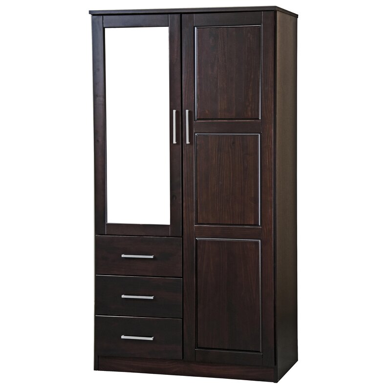 - DescriptionIn need of more storage? This modern armoire gives you extra space for all your favorite things. Its frame is made from solid pine wood in a crisp. versatile finish that goes with everything! A mirrored door gives you a convenient spot to check out your look and open up your room. It opens up to three open and adjustable shelves and a hanging rod that can house hats. sweaters. and ties. Three drawers open up on roller glides. allowing you to tuck away socks and delicates. Plus. one large open space with a hanging rod lets you hang up dresses. blazers. and other personal items.