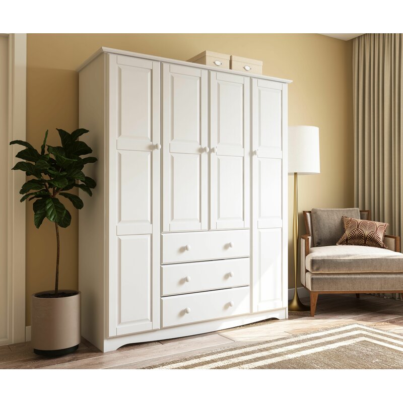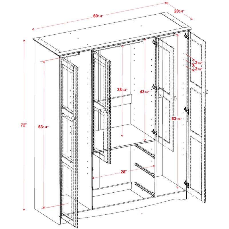 - DescriptionThis large 60-inch-wide wardrobe has something to offer to the entire family. Two side compartments have clothing rods at the very top allowing long dresses or coats to be hung while the middle section can be used for your shorter pieces. If more storage is needed for the folded garments. it can be expanded by adding up to three large and eight small adjustable shelves while a three-drawer mini-chest in the middle will store the smaller articles. Drawer metal Euro glides with safety stops offer smooth operation while drawers can hold substantial weight. The wardrobe is well-engineered. sturdy and functional. Made entirely of solid pine wood and hand-painted. it is aesthetically pleasing. silky smooth and practically knot-free. Available in 5 finishes. it will be compatible with many design ideas and interiors or you can choose from another matching in color and style furniture pieces designed by Palace Imports.
