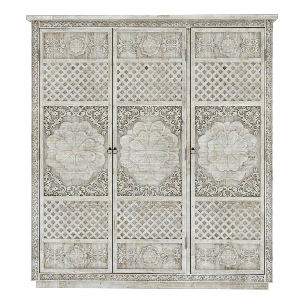 63" L X 20" D X 70" HBringing our Nuala Hand Carved Solid Wood 63” Large White Wardrobe Armoire will not only expand your bedroom storage but will also bestow a timeless beauty factor to the overall environment.?Expertly handcrafted by our talented artisans, this Solid wood masterpiece showcases its unmatched brilliance through the distressed weathered finish that runs throughout its frame, bringing out its classic hand-carved details that capture its facade. This 3 door wardrobe armoire features stunningly carved floral motifs and scrollings that turn it into an attention-worthy spectacle. Standing on an elegant platform base, this marvelous armoire boasts its streamlined silhouette that goes with a wide variety of interior styles.?The armoire doors, equipped with black wrought iron ring pulls, open to reveal two separate sections that lend your bedroom essentials and clothing items a generous and practical spot. The left portion offers four spacious drawers with recessed handles for smaller items along with an incredible large compartment with a detachable hanging rod. The right portion simply presents its master with five tier shelving that allow mindful arrangement of clothes, linens, bed covers, folded laundry, and other bedroom essentials.?Whether it’s the white elegance of this handcrafted wardrobe, or the unparalleled floral arabesques that charm its doors, the essence it generates will live forever in the closed walls of your bedroom. Warranting premium quality, this large wardrobe armoire is built to last for many years to come and to serve as a great focal point for your bedroom setting.??Special features:?? Solid wood craftsmanship? Entirely handcrafted?? Distressed whitewashed finish?? Hand-carved floral motifs doors?? Intricately carved details on doors and frame?? Wrought iron ring pulls? 4 drawers with recessed handles inside the armoire?? Five tier compartments for versatile storage?? Detachable hanging rod inside the armoire?? One big compartment for storage purposes??? Rectangular armoire top with extended edges??? Stands on a platform base?? Premium quality?Fully Assembled Furniture - The item comes fully assembled. Please measure your space for successful delivery.?Measure for successful delivery page link