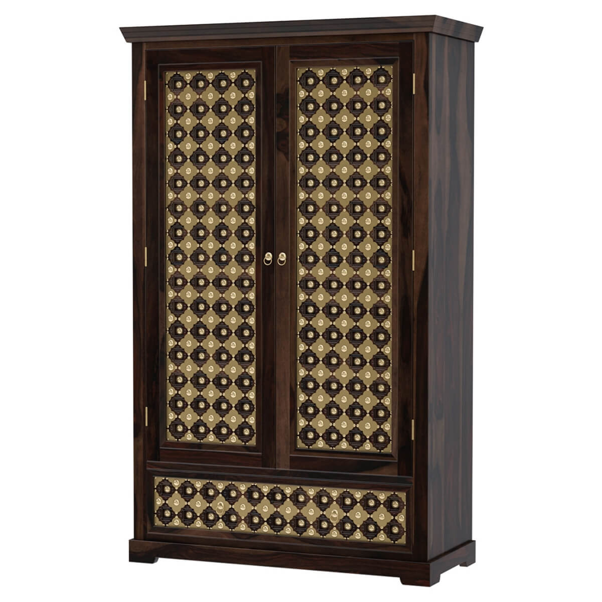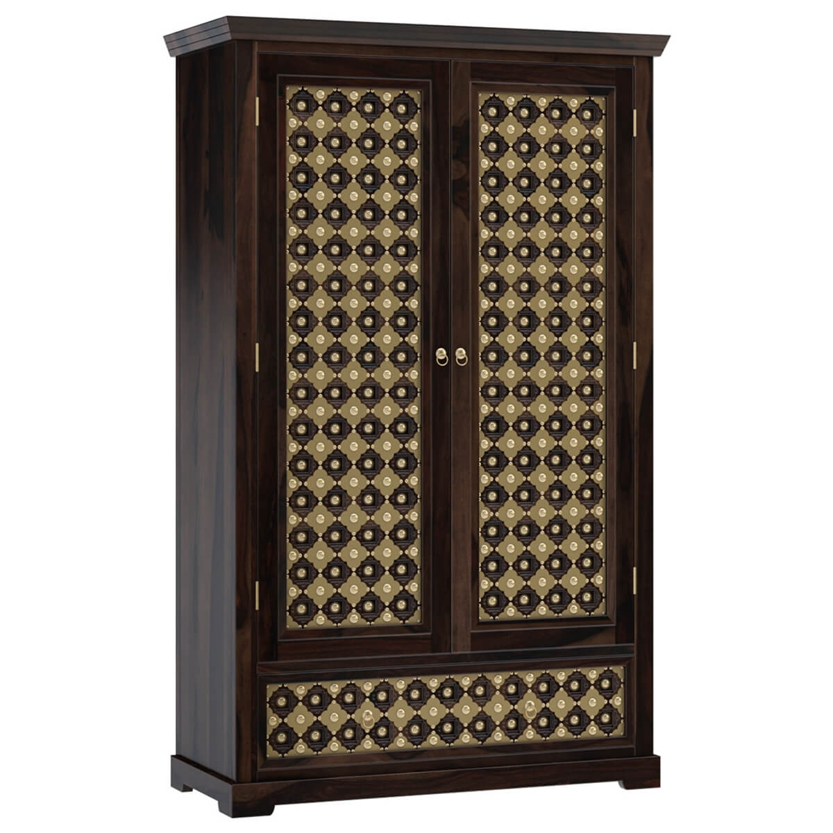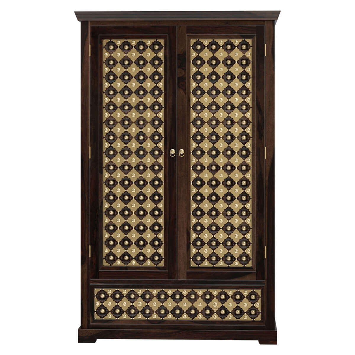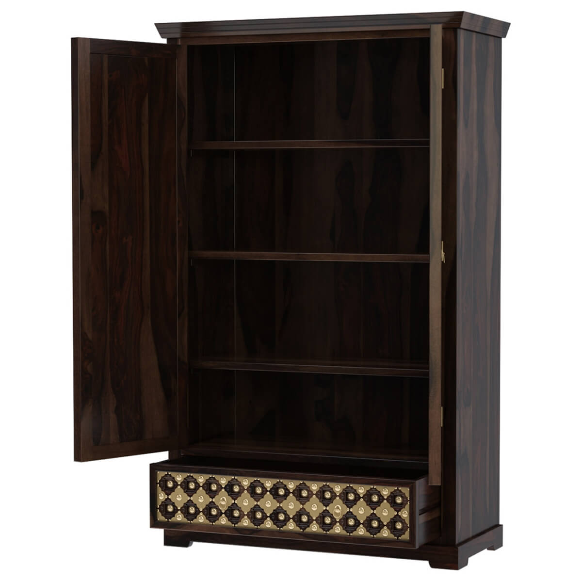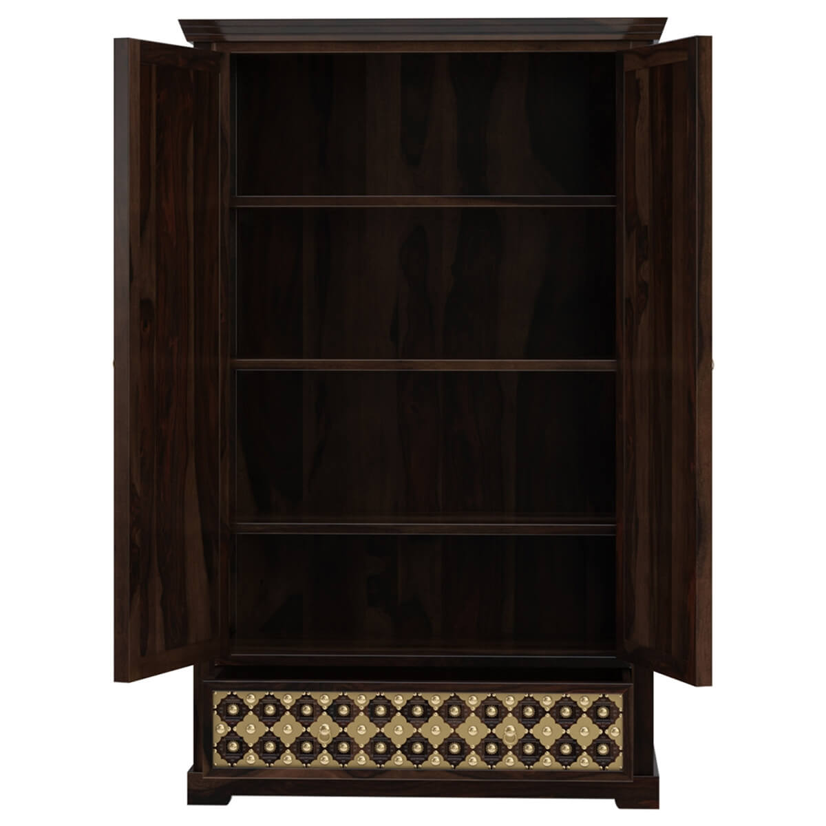 44.5" L X 19" D X 71.5" HA stunning choice for a variety of style aesthetics, our Diamond Empire Solid Wood Brass Inlay Armoire with 1 Drawer is a must-have to help conquer clutter and organize your home.Make a bold statement with this one-of-a-kind traditional armoire. Stunningly textured with a quatrefoil brass inlay and sunburst rivet accents, this solid wood armoire with 4 shelves and a drawer touts a vibrant and exotic feel. With a bevy of storage options, you can use this piece anywhere in the house where you need that little extra storage. Indeed, it is the perfect choice for a bedroom that needs a little extra closet space for wardrobe organization. The double closet doors open to shelved storage that can accommodate sweaters, linen and folded towels and spare blankets in the bedroom, board games and spare pillows in the den, or paperwork and office supplies in your home study. The single drawer at the base beautifully sums up the armoire's excellent closed storage options. There is even room along the top to decorate with pretty storage baskets, display a potted plant, or further personalize your home by topping with your cherished collectibles or curios.Brilliantly handcrafted, this solid wood armoire is artfully built with a vintage, worldly appeal. The brass inlay patterns are meticulously hand-applied using time-honored techniques and tools. Added ring pulls complement this aesthetic with a posh aura of elegance. Part of a 4 Piece Bedroom Set, you can easily complete your master suite with the global style of the collection's 1-Drawer Nightstand, Storage Platform Captains Bed, 5-Drawer Tall Dresser, and 6-Drawer Double Dresser.Special Features:? Entirely handcrafted? Made from 100% solid wood? Quatrefoil brass accents with sunburst rivets? Warm espresso stain finish? Platform base with bracket-style feet? Clean, modern crown molding trim? Sleek ring pull hardware? Double doors with interior shelving? Single drawer at the base? Part of a 4 Piece Bedroom SetFully Assembled Furniture - The item comes fully assembled. Please measure your space for successful delivery.?Measure for successful delivery page link