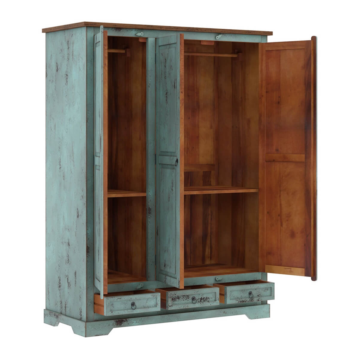55"L X 23.5"D X 74.5"HGive your cramped closet some wiggle room with the impressive organizational capacity of our Scranton Blue Two Tone Solid Wood Armoire Wardrobe with Hanging Rod & Shelves.?Whether you are running out of storage or are left with little to no closet space, this large armoire will solve much of your storage woes with three cabinet doors in addition to three drawers. This rustic distressed armoire is a visual treat in a two-tone palette. Inside, the three cabinet houses shelving for folded items alongside a garment rod for hanging pieces. The three drawers at the base of the armoire are perfectly accommodating to your smaller collections, finished with black wrought iron ring pulls that complement its visual aesthetics. Even the flat top prompts further storage for decorative baskets or as a platform for your extra items.??The two-tone appeal of this charmingly weathered armoire couples the soft touch of blue with the warm tones of natural wood for a design of unique distinction. The handmade old-world construction is boldly dependable, making it a piece that can withstand the generations to provide lasting beauty and enjoyment. Crafted from solid wood, it is robust and full of character. Overall, it's a great coastal-style furniture piece for your den, dining room, bedroom, or sunroom that will easily provide all the extra storage you could possibly need.?Special features:? Entirely handcrafted? Solid wood craftsmanship? Two-tone color palette with beautiful contrast? Distressed finish and weathered surface?? Wooden door latches and wrought iron hardware?? Cabinets with shelving and hanging rod? Three drawers? Triple door armoire wardrobe?? Incredible storage? Anti-tip kit included? Premium quality?? Easy maintenance