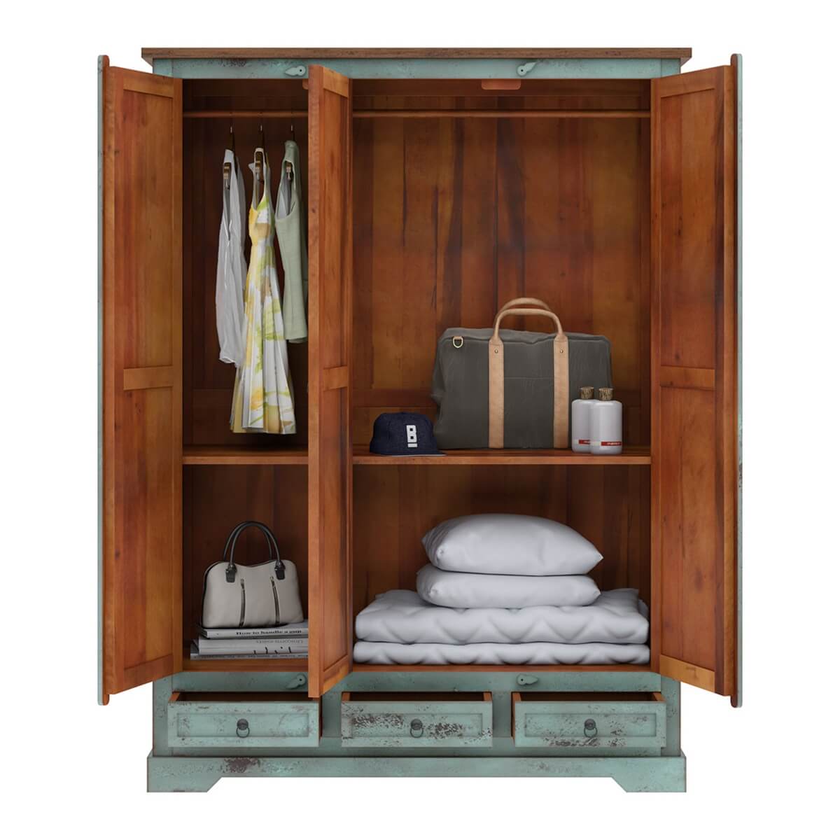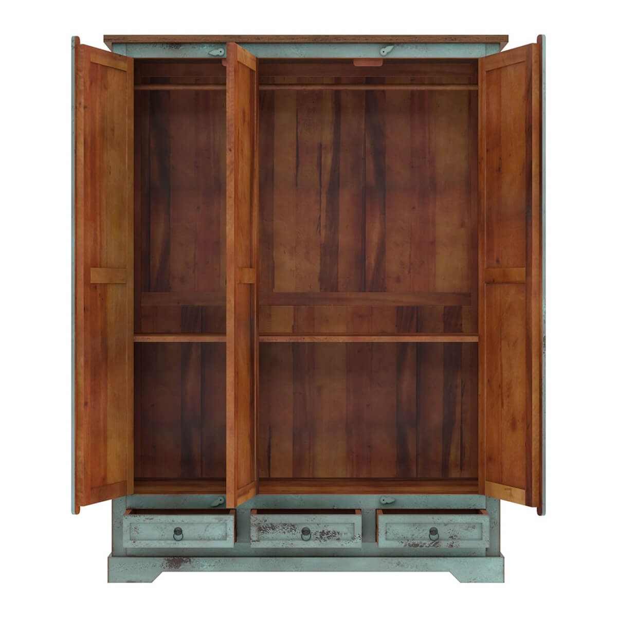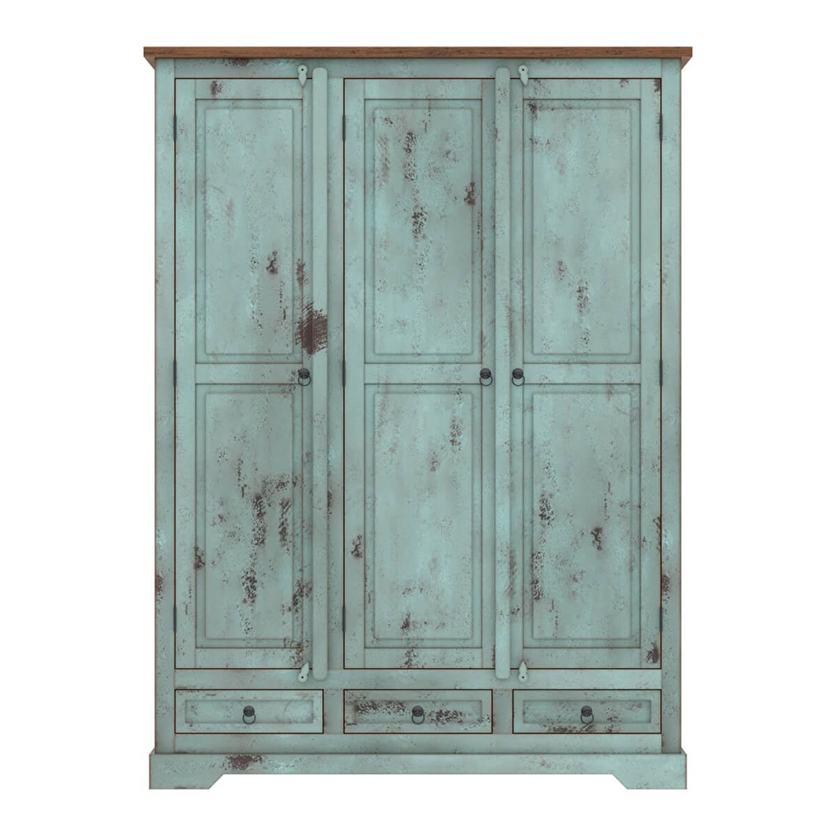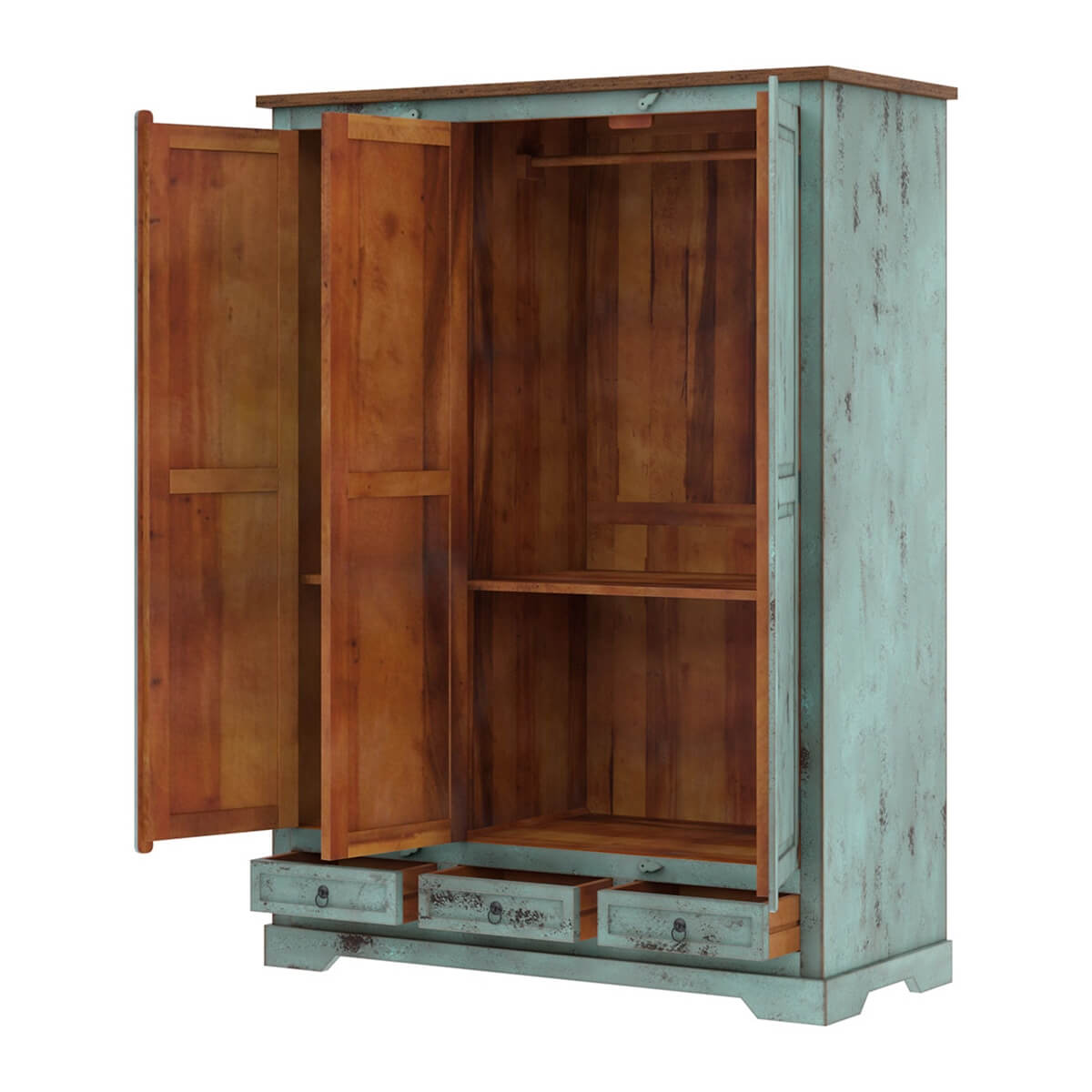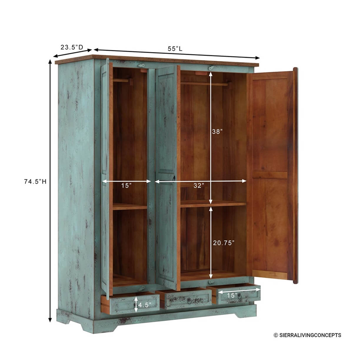 55"L X 23.5"D X 74.5"HGive your cramped closet some wiggle room with the impressive organizational capacity of our Scranton Blue Two Tone Solid Wood Armoire Wardrobe with Hanging Rod & Shelves.?Whether you are running out of storage or are left with little to no closet space, this large armoire will solve much of your storage woes with three cabinet doors in addition to three drawers. This rustic distressed armoire is a visual treat in a two-tone palette. Inside, the three cabinet houses shelving for folded items alongside a garment rod for hanging pieces. The three drawers at the base of the armoire are perfectly accommodating to your smaller collections, finished with black wrought iron ring pulls that complement its visual aesthetics. Even the flat top prompts further storage for decorative baskets or as a platform for your extra items.??The two-tone appeal of this charmingly weathered armoire couples the soft touch of blue with the warm tones of natural wood for a design of unique distinction. The handmade old-world construction is boldly dependable, making it a piece that can withstand the generations to provide lasting beauty and enjoyment. Crafted from solid wood, it is robust and full of character. Overall, it's a great coastal-style furniture piece for your den, dining room, bedroom, or sunroom that will easily provide all the extra storage you could possibly need.?Special features:? Entirely handcrafted? Solid wood craftsmanship? Two-tone color palette with beautiful contrast? Distressed finish and weathered surface?? Wooden door latches and wrought iron hardware?? Cabinets with shelving and hanging rod? Three drawers? Triple door armoire wardrobe?? Incredible storage? Anti-tip kit included? Premium quality?? Easy maintenance