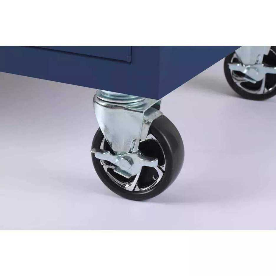 The Husky 56"W x 24.5"D 5-Drawer Mobile Workbench is an exciting new addition to the Husky mobile workbench line. This workbench features fully welded steel construction and is available in a variety of powder coating options. Featuring a solid wood top, this unit offers a generous 1,372 square feet of space, perfect for any project. Each drawer opens and closes easily on ball bearing slides rated for up to 120 pounds. And features a soft-close retention system that prevents the drawer from slamming shut and ensures the drawer stays closed. The bottom drawer has 2 sets of slides to accommodate heavier tools and supplies. All drawers come with pre-cut liners to protect your tools. To the right of the workbench is a large storage area offering 6,430 cubic meters of storage space. inches of storage space and adjustable shelves rated for 130 lbs. There is an integrated power strip on the right side of the workbench with 6 power outlets and 2 USB ports to keep your tools and electronic accessories powered at all times. Making this workbench mobile are four 5-inch x 2-inch casters with stylish hubcaps that can support up to 1,200 pounds. and ergonomic tubular push handle. Finally, you can rest assured that your tools are secured with an internal locking system.