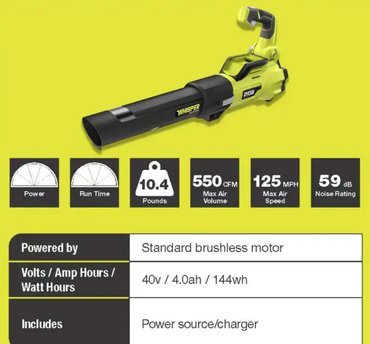 - Blower: quietest handheld blower in the industry