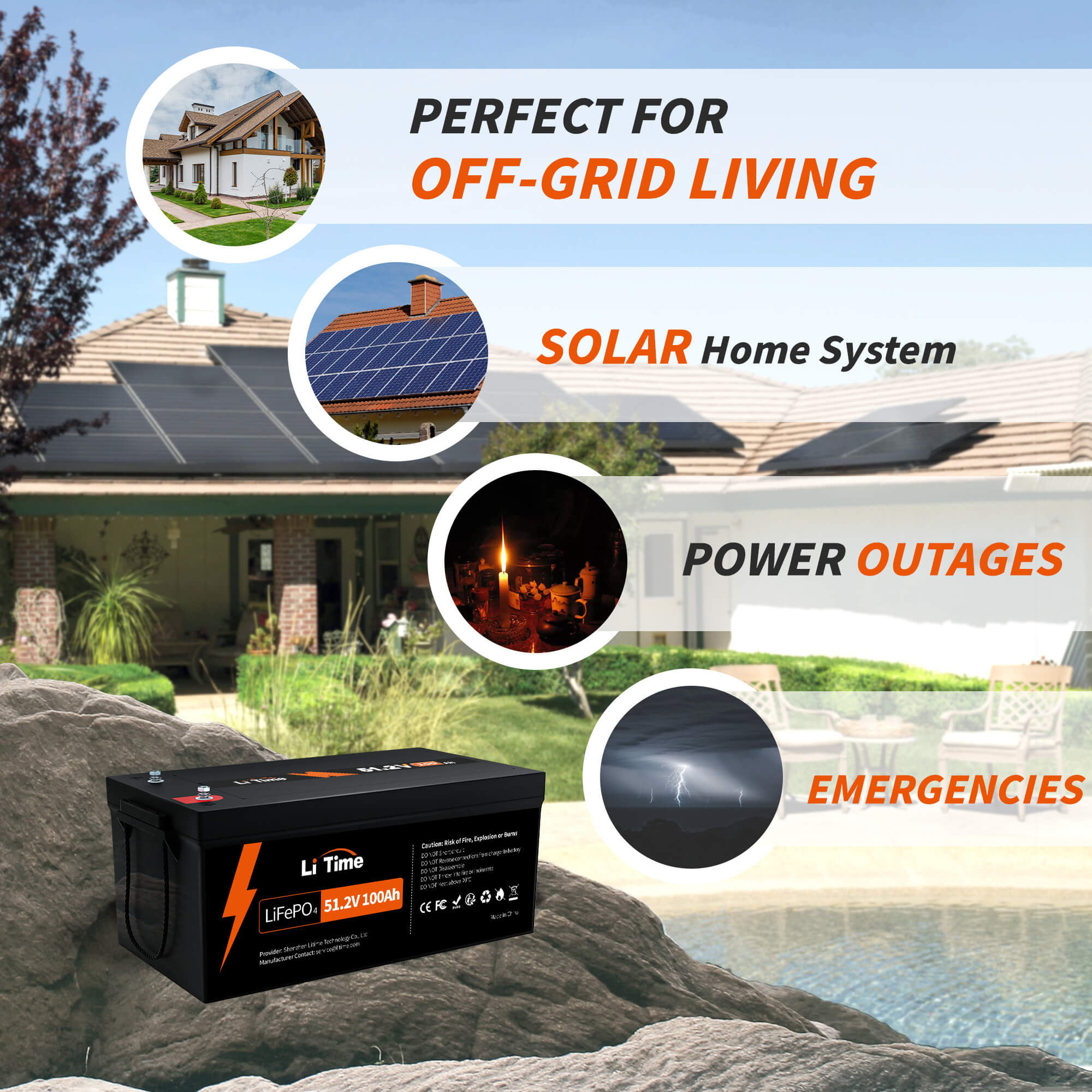 【10 Days Nonstop Power Supply】With LiTime 51.2V 100Ah lithium batteries, you can enjoy up to 10 days of uninterrupted power for your home (assuming a minimum daily usage of 0.5kWh) and avoid any grid outages. With 100A BMS and 5120W output, you can even power heavy-duty appliances such as air conditioners and dryers at the same time. Plus, you can connect them in parallel to increase power output (max. 4P for 20.48kW).