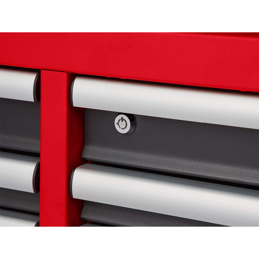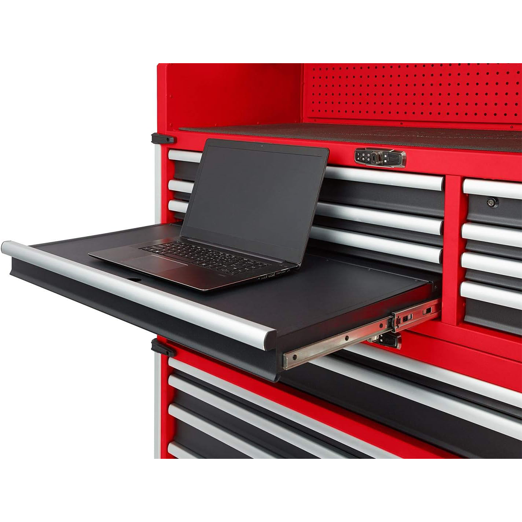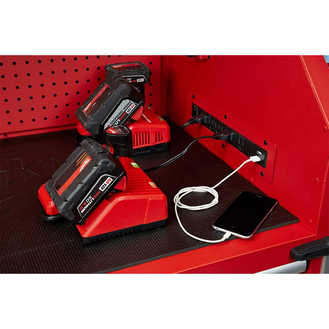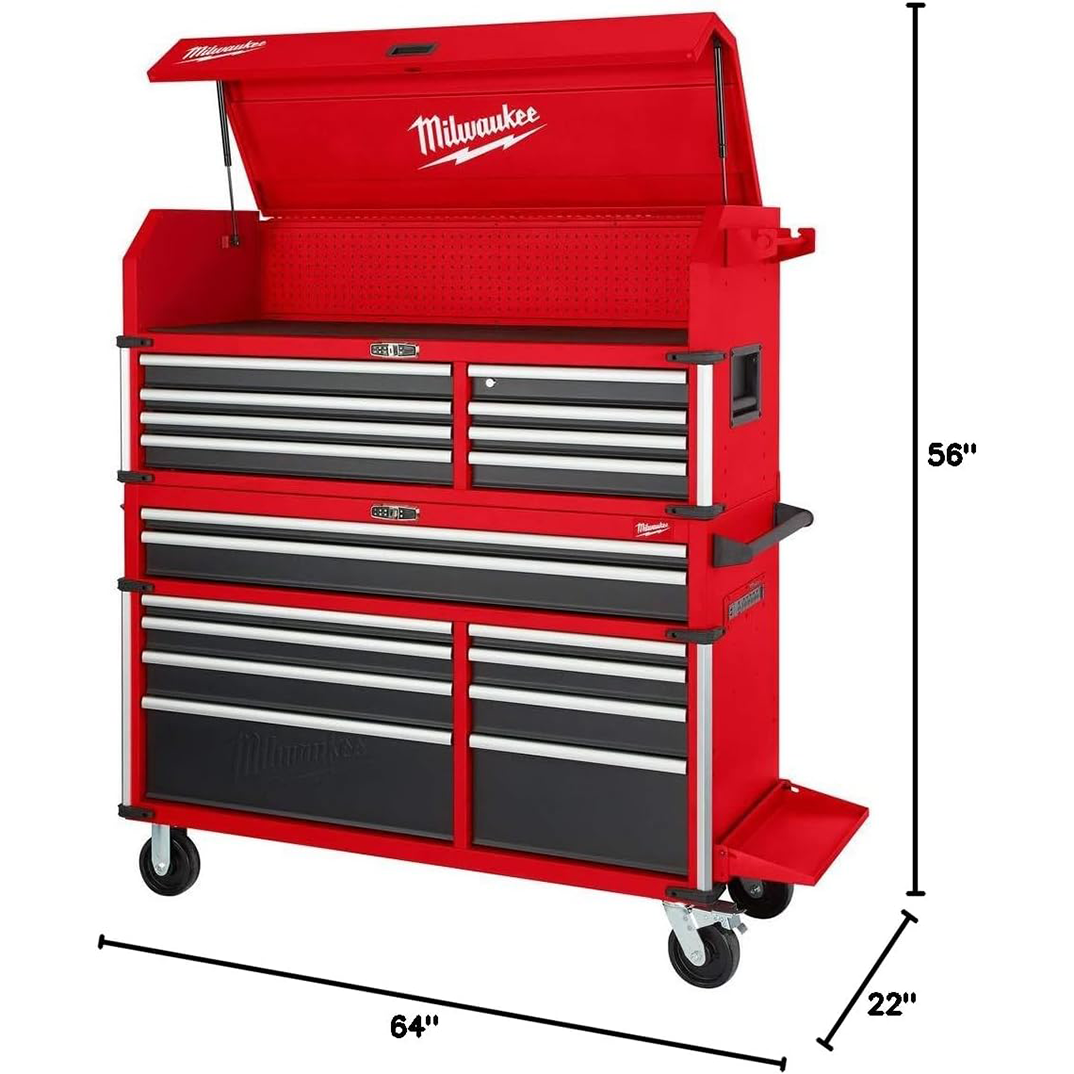 The next generation of Milwaukee high capacity steel tool storage is here. Loaded with features, the Milwaukee High Capacity 56 in. 18-Drawer tool chest and tool cabinet combo boasts a massive 44,055 cu. in. of storage capacity and can hold over 3,000 lbs. The 18-drawer combo is an extra-deep 22 in., which is 4 in. deeper than most other units. The 150 lbs. rated, soft-close, ball bearing drawer slides gently retain the drawers from accidental opening or slamming shut. The chest has an extensive list of features including an integrated peg wall in the chest, paper towel holder, 2 J-hooks to store your hoses and cords, and stylish aluminum edge guards with rubber corner bumpers to help protect your investment. There is also an innovative pullout work surface drawer and security drawer which can be locked separately from the rest of the drawers. Additional features within the cabinet include a long tool holder, folding side shelf, bottle opener, and stylish aluminum edge guards with rubber corner bumpers to help protect your investment. There are 2 full-width, top drawers to provide storage for all your long tools and pry bars. Integrated power strips, each with 6 outlets and 2 USB ports, are in the top till and outside wall of the cabinet. The 9.5 in. D bottom cabinet drawers offer additional organization options with a removable power tool organizer. Lastly, the combo is equipped with Digital Locks, which means there is no need for additional keys in your pocket.