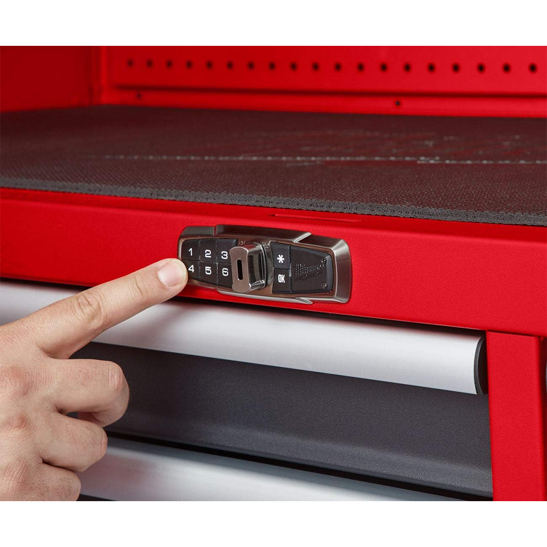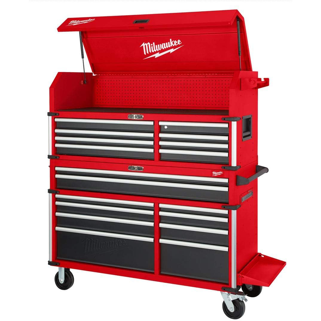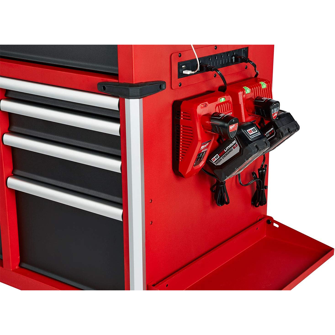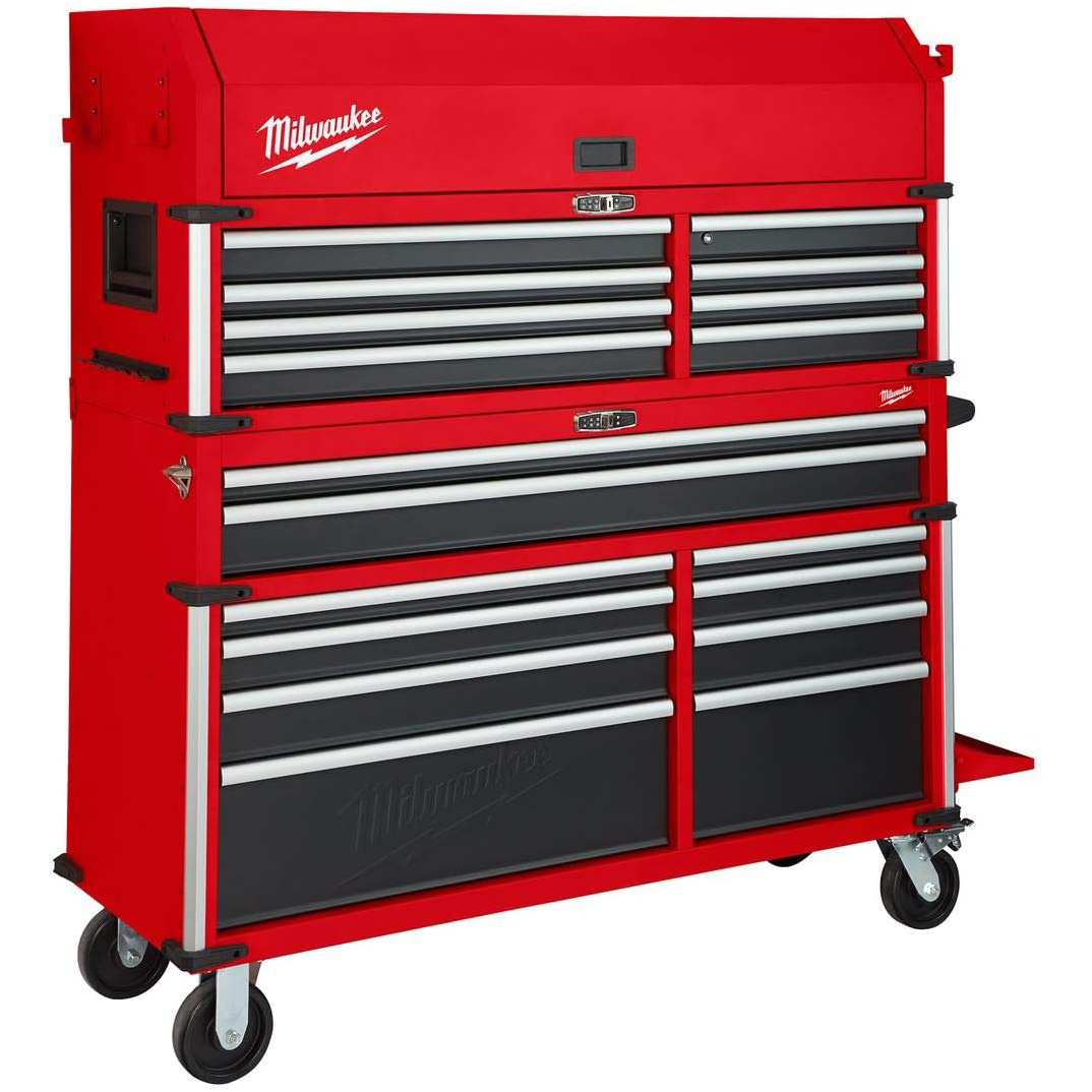 The next generation of Milwaukee high capacity steel tool storage is here. Loaded with features, the Milwaukee High Capacity 56 in. 18-Drawer tool chest and tool cabinet combo boasts a massive 44,055 cu. in. of storage capacity and can hold over 3,000 lbs. The 18-drawer combo is an extra-deep 22 in., which is 4 in. deeper than most other units. The 150 lbs. rated, soft-close, ball bearing drawer slides gently retain the drawers from accidental opening or slamming shut. The chest has an extensive list of features including an integrated peg wall in the chest, paper towel holder, 2 J-hooks to store your hoses and cords, and stylish aluminum edge guards with rubber corner bumpers to help protect your investment. There is also an innovative pullout work surface drawer and security drawer which can be locked separately from the rest of the drawers. Additional features within the cabinet include a long tool holder, folding side shelf, bottle opener, and stylish aluminum edge guards with rubber corner bumpers to help protect your investment. There are 2 full-width, top drawers to provide storage for all your long tools and pry bars. Integrated power strips, each with 6 outlets and 2 USB ports, are in the top till and outside wall of the cabinet. The 9.5 in. D bottom cabinet drawers offer additional organization options with a removable power tool organizer. Lastly, the combo is equipped with Digital Locks, which means there is no need for additional keys in your pocket.